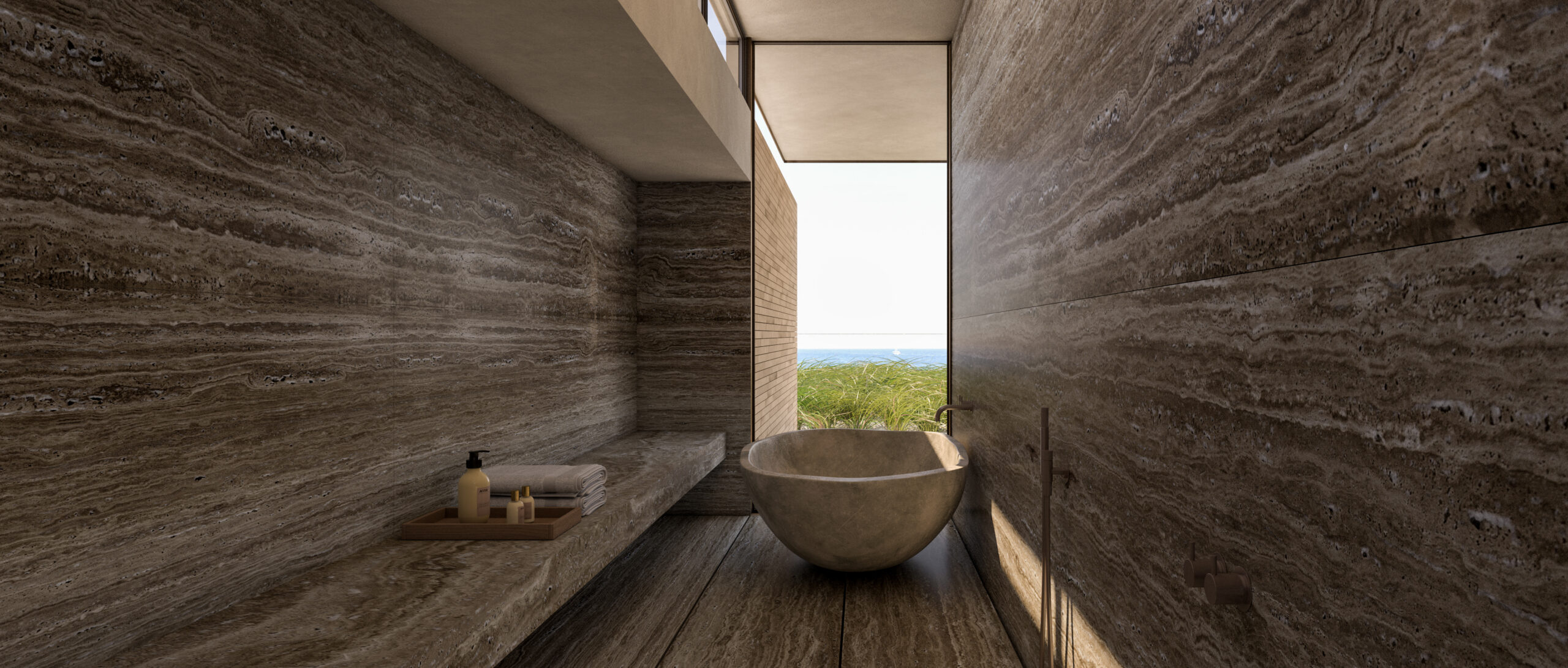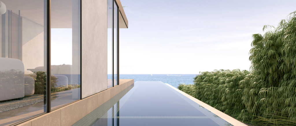 The program unfolds across four levels: a private wellness center and guest suite at entry, ocean-facing bedrooms on the mid-level, and a main living floor anchored by an elegant lap pool that channels calm energy outward to the horizon.